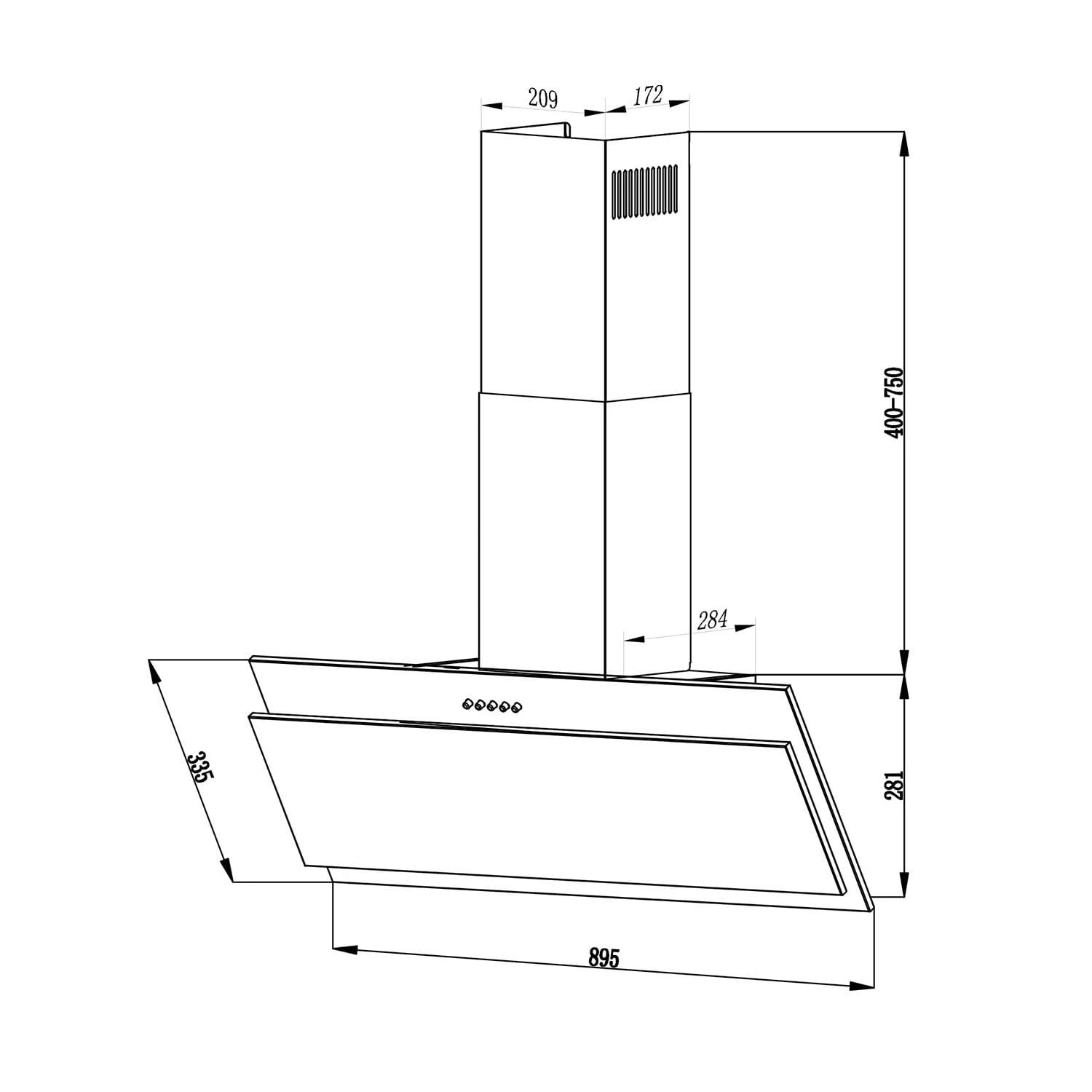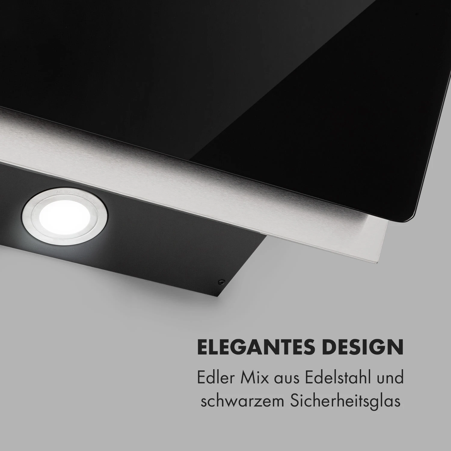 Neben den starken Leistungsdaten überzeugt die Alessia Wandabzugshaube als luxuriöser Teil der Kücheneinrichtung: Die schwarze Front aus glänzendem Sicherheitsglas verleiht ihr ein modernes Aussehen, das durch eine Kaminverkleidung aus Edelstahl ergänzt wird.