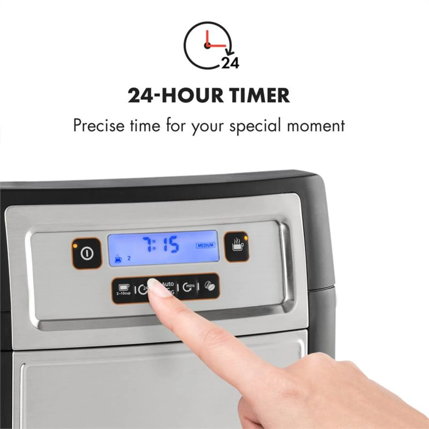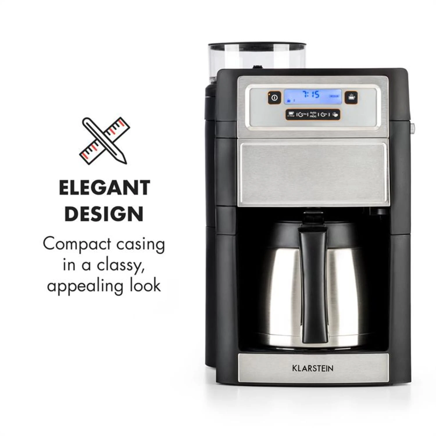 Für einen genussvollen Start in den Tag: die Klarstein Aromatica II Thermo Kaffeemaschine sorgt mit einem integrierten Mahlwerk, unterschiedlichen Mahlgraden und einem praktischen Timer für einen Alltag voller belebender Momente.