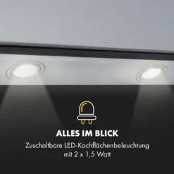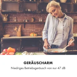 Die Klarstein Balzac Silent 60 Dunstabzugshaube sorgt mit 250 Watt Motorleistung im Umluftbetrieb für dunstfreie Luft in kleinen bis mittleren Küchen. Drei Leistungsstufen liefern bis zu 604 m³ Abluftleistung in der Stunde und passen die kopffreie Wandabzugshaube dem jeweiligen Kochaufkommen gezielt an. Dabei ist die Balzac Silent 60 mit nur 60 dB auf der höchsten Stufe äußerst geräuscharm. Besonders praktisch ist die nach oben aufstrebende Konstruktion der 60 cm breiten Haube, die dem Kopf die nötige Bewegungsfreiheit beim Kochen verleiht. Dabei benötigt die Ablufthaube in der Tiefe kaum Platz. Ein zuschaltbares Licht mit 2 x 1,5 Watt LED-Lampen sorgt für gute Sichtverhältnisse am Herd. Per frontseitigem Touch-Display kannst du Lüftung und Beleuchtung bequem steuern. Ein Quick-Timer lüftet unkompliziert für 5 Minuten nach und schaltet das Gerät danach ab.