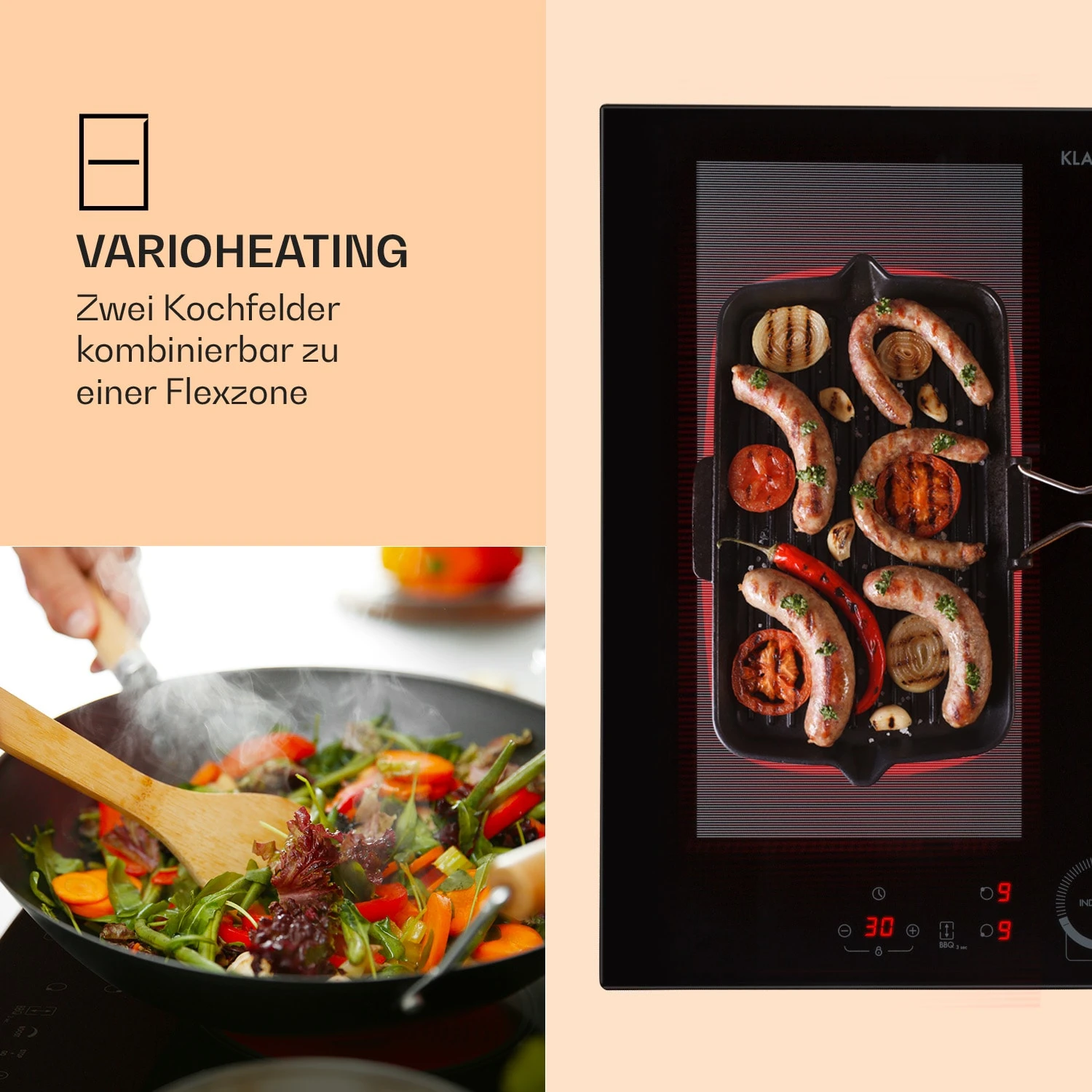 Einfach flexibler Kochen: Das Klarstein Delicatessa 60 Hybrid Induktionskochfeld erlaubt optimale Platznutzung bei minimalem Energieverbrauch. Dabei verbindet es technische Innovation mit luxuriösem Aussehen und bringt mit seiner Oberfläche aus Glaskeramik neuen Glanz in die Küchenzeile. Daneben bietet das Einbaukochfeld hohe Sicherheit: durch Überhitzungsschutz, Topferkennung, Restwärmeanzeige, Abschaltautomatik und Kindersicherung. Die VarioHeating Flexzonen-Technik ermöglicht die Verbindung von zwei Kochfeldern zu einer Kochzone.