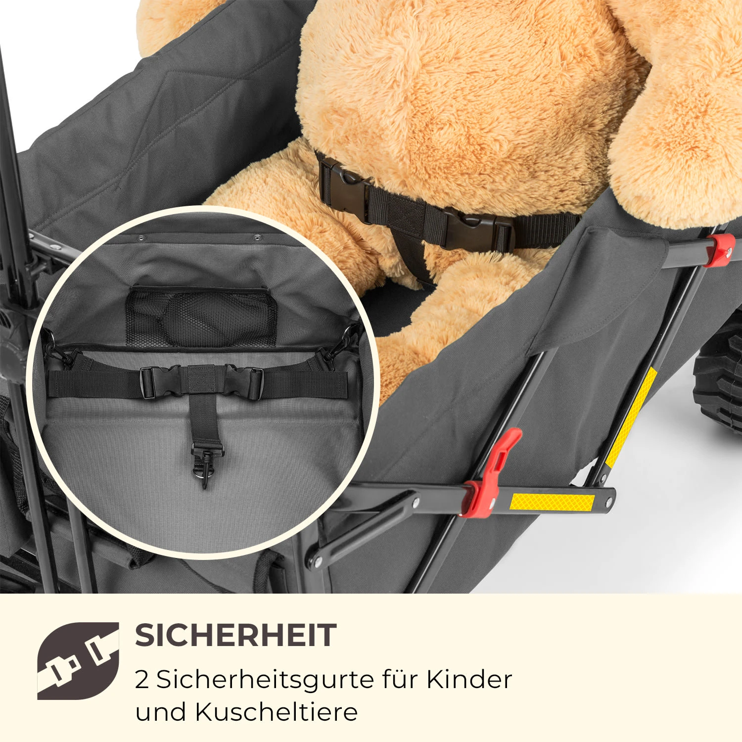 Mithilfe der ausziehbaren Teleskopstange vorne und der klappbaren Schubstange hinten lässt sich der Bollerwagen wunderbar einfach ziehen oder schieben. Die Räder sind frei beweglich und mit Kugellagern ausgestattet, was geschmeidiges und leichtes Fahren garantiert. Für extra Sicherheit, was vor allem beim Transport von Kindern wichtig ist, sorgen die beiden Sicherheitsgurte im Innern und die Reflektoren außen am Wagen. Dank des gepolsterten Bodens ist beim Transport jederzeit ein hoher Sitzkomfort gegeben, der allen Kindern gefallen wird.
