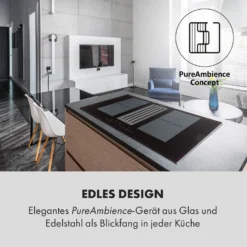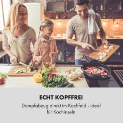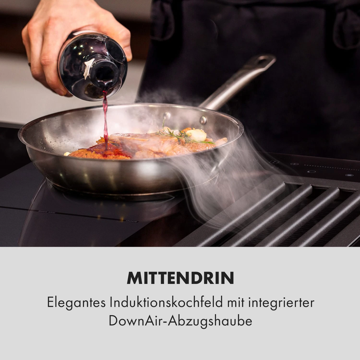 Mittendrin statt nur dabei: Das Klarstein Full House DownAir System revolutioniert die Küche indem es sein Induktions-Kochfeld direkt mit einer DownAir Abzugshaube kombiniert. So verschwinden Küchendampf und -gerüche direkt dort, wo sie entstehen. Dabei nutzt das System modernste Technik, wie VarioHeating für Flexzonenbetrieb, ein SenseControl-Touchbedienfeld und den leistungsstarken ThermoBoost und verbindet sie im PureAmbience Design mit einer edlen Oberfläche aus schwarzem Glas.