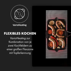 Vier Kochflächen für den kleinen bis großen Hunger besitzt das leistungsstarke Induktions-Kochfeld des Klarstein Full House Down Air Systems. Jeweils zwei Kochflächen befinden sich links und rechts der Ansaugöffnung der DownAir-Haube und können dank VarioHeating Systems praktisch zu jeweils einer großen Flexzone, zum Beispiel für Kasserollen oder große Töpfe und Pfannen, verbunden werden. Jedes Kochfeld kann in 9 Stufen eingestellt werden und besitzt eine ThermoBoost-Funktion zum Steigern der Leistung für blitzschnelles Aufkochen. Topferkennung, Stop and Go Funktion mit ThermalRecall, Restwärmeerkennung, Kindersicherung und Warmhaltefunktion runden das Einsatzspektrum der Kochfläche perfekt ab.
