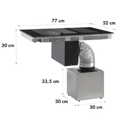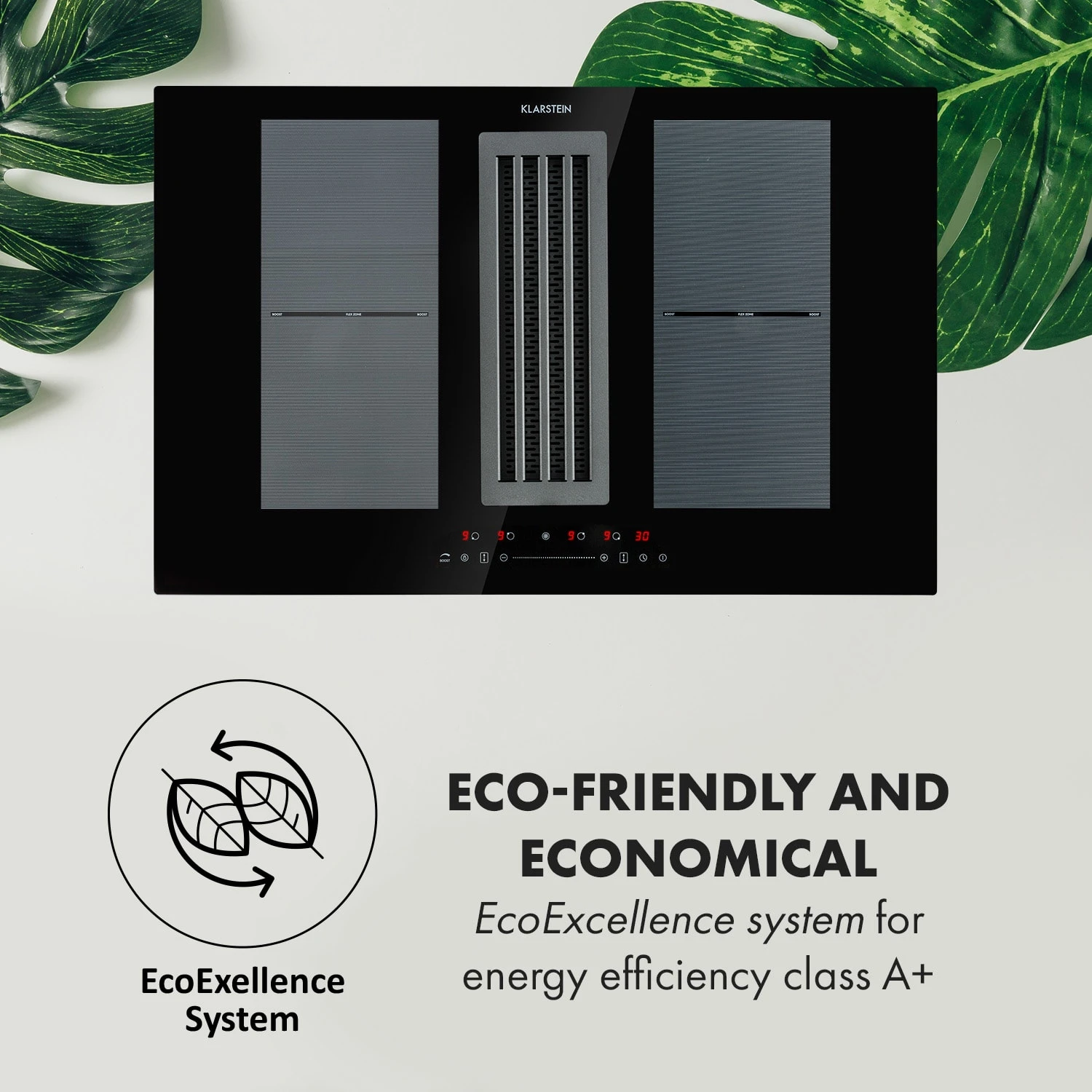 Im Mittelpunkt Ihrer neuen Küche steckt beim Klarstein Full House Down Air System, fast unsichtbar unter einer schwarzen Edelstahlabdeckung, das saugstarke Herzstück: eine Down Air Abzugshaube im Abluftbetrieb. Im Gegensatz zu herkömmlichen Hauben, versperrt die Ihnen niemals das Gesichtsfeld, denn sie ist direkt Teil des Kochfelds und saugt Dampf und Gerüche nach unten ab. Damit eignet sie sich perfekt für typische amerikanische Küchen mit zentraler Kochinsel, an der Sie gemeinsam mit Freunden und Familie kochen können. Mit ihrem 270 m³/h starken AeroEfficiency System ist sie besonders effektiv und sparsam und verdient sich direkt die Energieeffizienzklasse A+. Wie bei den bekannten DownDraft-Hauben befindet sich der Motor sowie der Abluftschlauch unsichtbar unter der Arbeitsplatte.