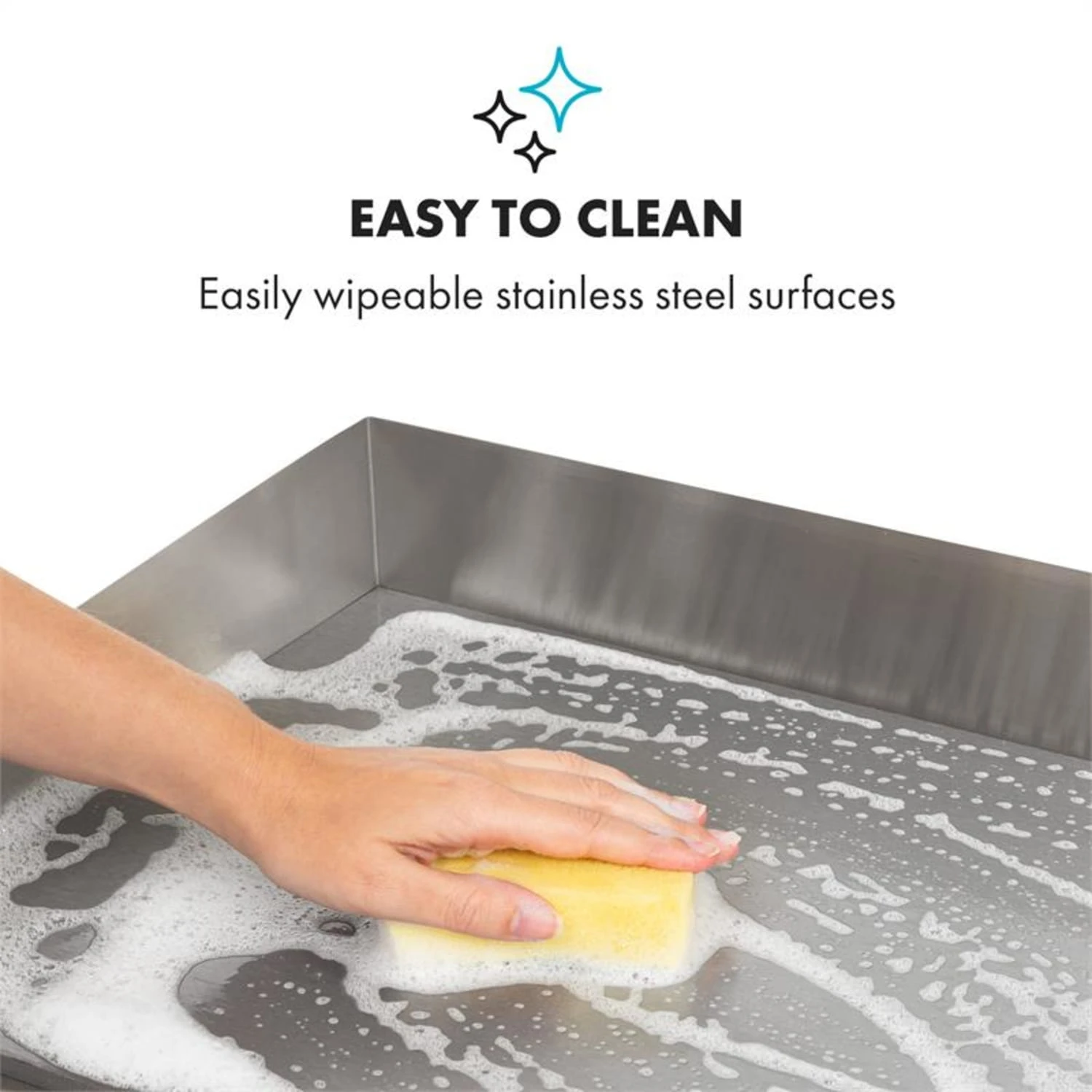 Mit dem Klarstein Grillmeile 3000G Elektrogrill hat der kleine Hunger keine Chance. Mit 3000 Watt Leistung bräunt und gart er ohne Unterlass Steaks, WĂĽrstchen oder direkt ganze Pfannengerichte. Besonders praktisch ist dabei seine stufenlos regulierbare Temperatur von 50 bis 300 °C – so ist er richtig heiĂź, wenn schnell viele Kunden mit Grillspezialitäten versorgt werden mĂĽssen und kann auf energiesparendes Warmhalten gestellt werden, wenn der Andrang etwas nachlässt. Die groĂźe Gusseisen-Grillplatte von 54,5 x 35 cm bietet sich mit ihrer glatten Oberfläche vor allem fĂĽr Pfannengerichte an, die direkt auf der Platte gegrillt und gewendet werden, ohne das irgendwo etwas anbäckt. Ein umlaufender Spritzschutz sorgt fĂĽr die Sicherheit der Kundschaft und bietet praktischen Widerstand beim Wenden. ĂśberschĂĽssiges Ă–l flieĂźt in die herausnehmbare Auffangschale und kann am Ende des Grillevents einfach entsorgt werden.