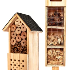 Der handgefertigte Brutkasten besitzt mehrere Hohlräume im Holz und darüber hinaus einige Bambusröhrchen, die sich als Nist- und Schlafplatz für Bienen bewährt haben. Die drei unteren Kammern sind mit Kiefernzapfen, Sägespänen bzw. Holzstückchen befüllt und locken deshalb vor allem Fliegen und Käfer an! In der Mitte befindet sich ein Schmetterlingshaus, welches den Tieren einen geeigneten Rückzugsort bietet.