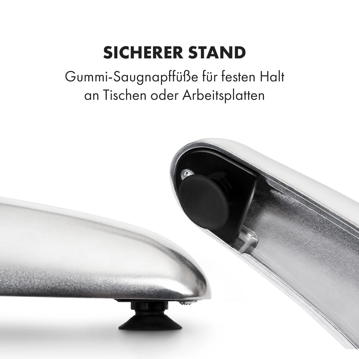 Wie es euch gefällt. Im Klarstein Kraftprotz Milchshaker wird aus Milch eine leckere Erfrischung mit Früchten, Kakao, Eiscreme und vielem mehr. Oder er unterstützt Sie mit gesunden Protein-Shakes in Ihrem Fitnesstraining. Endlich kann jeder in der eigenen Küche nach Herzenslust seiner Milkshake-Liebe fröhnen und das in professioneller Klarstein-Qualität! Stufenlos regelbare 300 Watt Leistung rühren oder zerkleinern die Zutaten im 0,9 Liter großen Shaker aus Edelstahl. Der fasst bis zu 0,6 Liter an Zutaten und kann in zwei Höhen – zum Mixen oder Rühren – am Standfuß des Kraftprotz eingehängt werden. Je nach Arbeitsschritt wird entweder das vierflügelige Messer oder die Rührscheibe auf dem Mixerstab angebracht. Sind alle Leckermäuler mit cremigem Genuss versorgt, können die abnehmbaren Mixerteile ganz einfach im Geschirrspüler gereinigt werden. Für Sicherheit beim Arbeiten sorgen rutschfeste Saugnapffüße, die den Mixer auch bei hohen Drehzahlen fest an der Tischplatte halten.