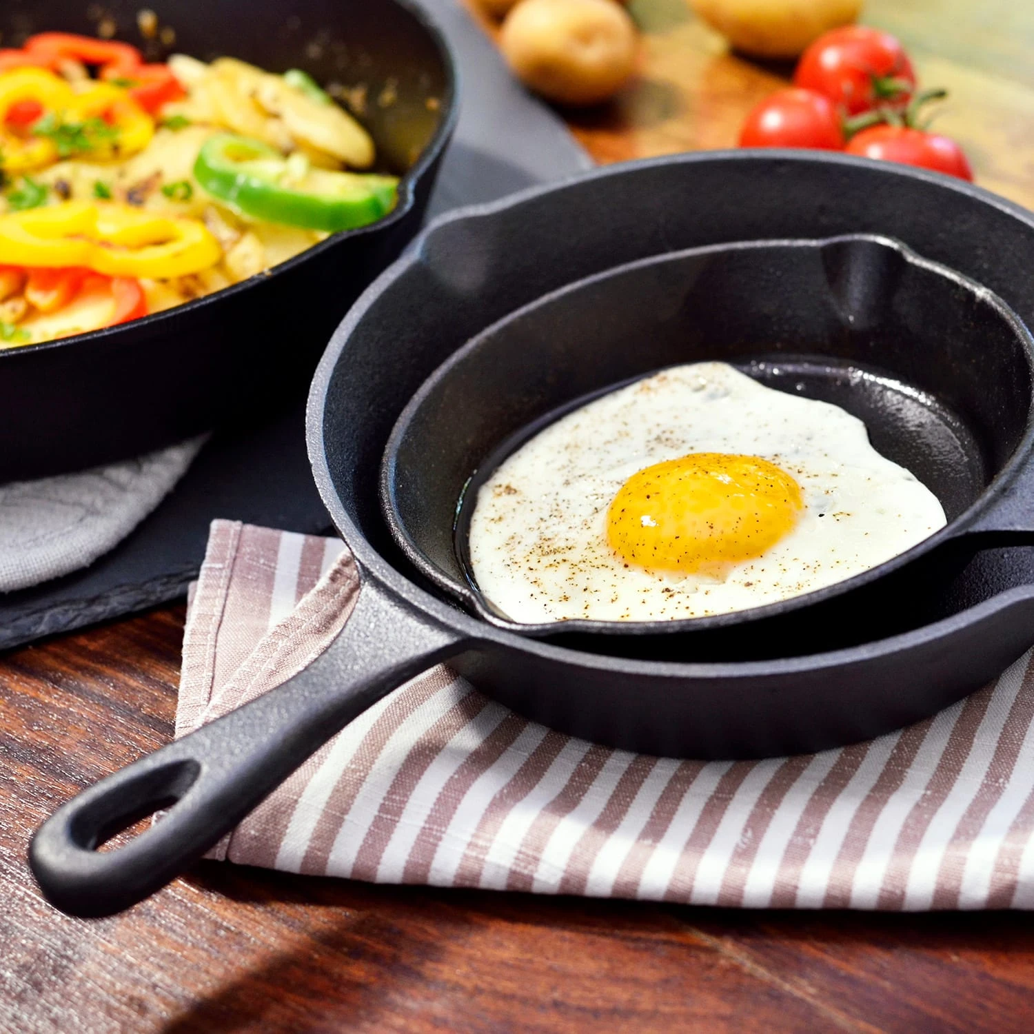 Langlebig und universal einsetzbar: Die Klarstein Parthenaise Pfannen kommen im praktischen 3er-Set zu dir nach Hause und sind aus robustem Gusseisen gefertigt, das für eine optimale Hitzeverteilung sorgt. Egal ob auf dem heimischen Herd, im Backofen oder beim Outdoor-Kochen. Ideal für Steaks, Würstchen, Bratkartoffeln sowie Gemüse und Eierspeisen. Die Parthenaise sind bereits voreingebrannt und sofort einsatzbereit. Für ein einfaches Handling liegt den Bratpfannen noch eine Griffschutzhülle aus Silikon bei.