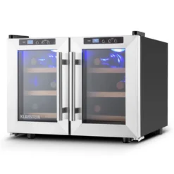 Hinter den beiden doppelt isolierten Edelstahlglastüren des Klarstein Reserva Saloon Weinkühlschranks finden bis zu 12 Flaschen Wein auf jeweils drei Holzregaleinschüben beste Lagerbedingungen. In diskretem LED-Licht inszeniert, werden sie auf beste Trinktemperaturen gekühlt und aufbewahrt, damit sie jederzeit ihr volles Aroma entfalten können. Die gewünschte Temperatur für Weiß-, Rot-, Rosé- oder Schaumweine wird in Ein-Grad-Schritten über die in den Türen integrierte Armatur eingestellt.