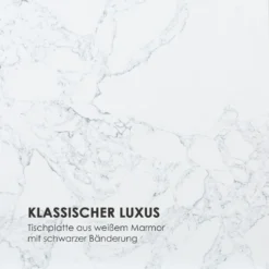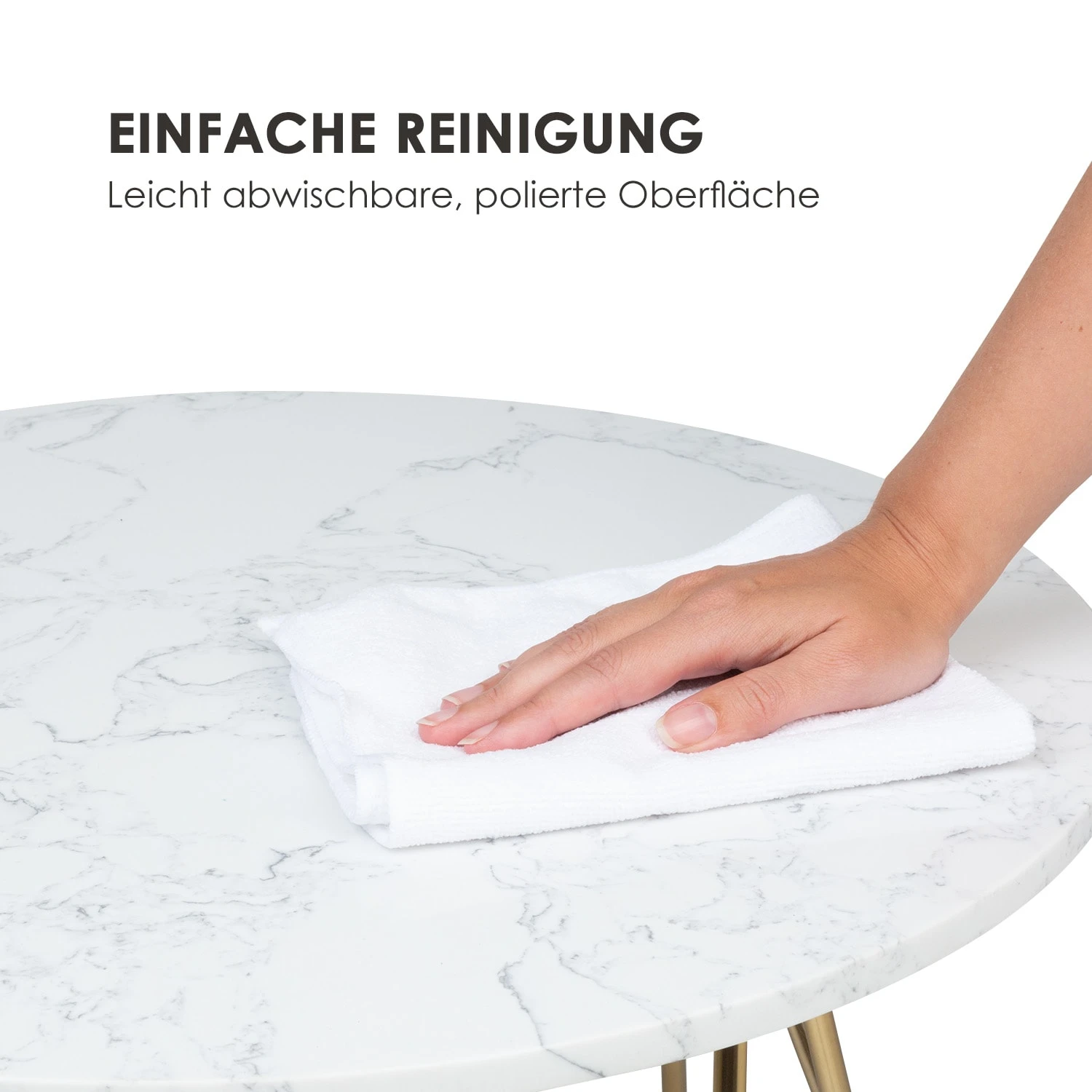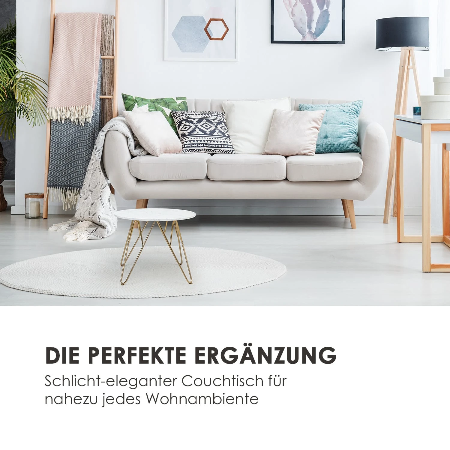Zeitlose Eleganz ist der Anspruch des Besoa Round Pearl Beistelltisches. Seine glatt polierte Tischplatte aus weißem Marmor mit schwarzer Bänderung erweckt den Luxus des Sonnenkönigs bei Ihnen zuhause. Die edle Tischplatte wird durch das goldfarbene Metallgestell zusätzlich unterstrichen. Dabei bleibt der Couchtisch in seiner Formensprache modern und schnörkellos, sodass er sich perfekt in Ihr Wohnambiente einfügt. Mit seinen praktischen Maßen von 55 x 45 cm eignet sich der Round Pearl ideal als Couch- oder Beistelltisch.