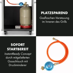 - Betriebsfertig: inklusive Druckminderer und Schlauch (Gasflasche nicht enthalten)