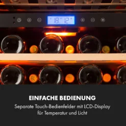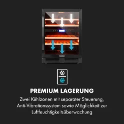 Edles Design und farbige Präsentation: Der Klarstein Vinovilla 43 Built-In Duo Onyx Edition Doppelzonen-Weinkühlschrank schenkt deinen Weinen die perfekte Trinktemperatur und setzt sie gekonnt in ein schönes Licht. Neben der modernen gerahmten Glastür trumpft der Vinovilla 43 Built-In Duo Onyx Edition vor allem durch seine zwei Kühlzonen mit unterschiedlichen Lagertemperaturen auf. Dank diesen kannst du weiße und rote Weine gleichzeitig kühlen und optimal lagern. Ein großes Highlight ist dabei die dreifarbige Beleuchtung, welche die Flaschen raffiniert in Szene setzt.