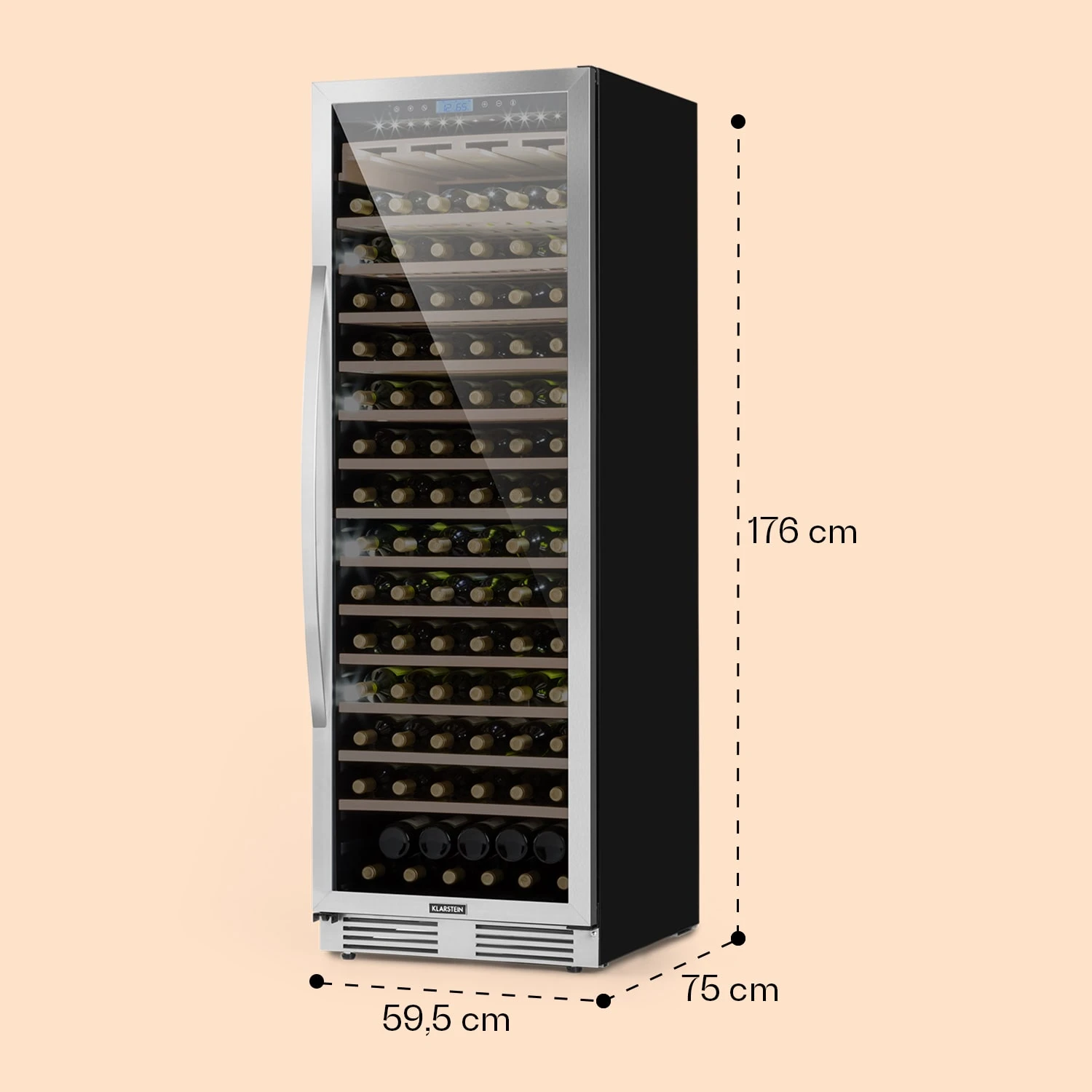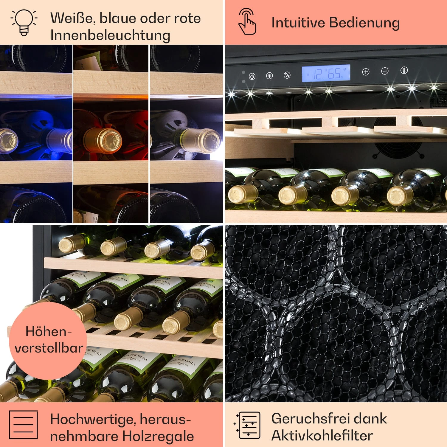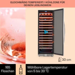 Der beleuchtete Klarstein Vinovilla Grande 165 Built-in Uno Weinkühlschrank bietet auf 13 Buchenholz-Einschüben Platz für 165 Flaschen Wein. Die edlen Tropfen ruhen bei passender Lagerungstemperatur, welche du bequem per Touch-Display wählen kannst. Perfekt gekühlten Genuss erlebst du, da du parallel auf dem Glasträgerhalter bis zu 24 Weingläser auf die gleiche Kühltemperatur bringen kannst.